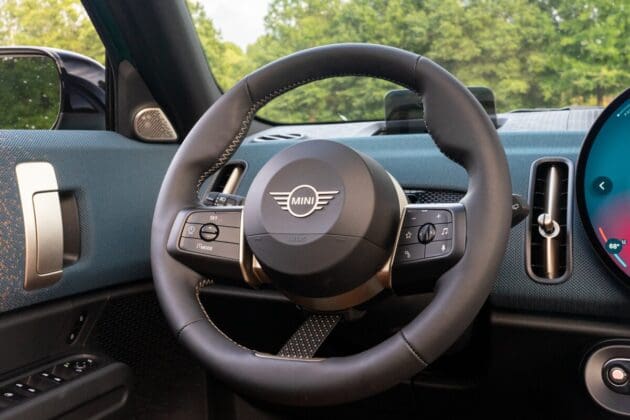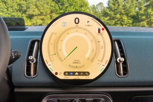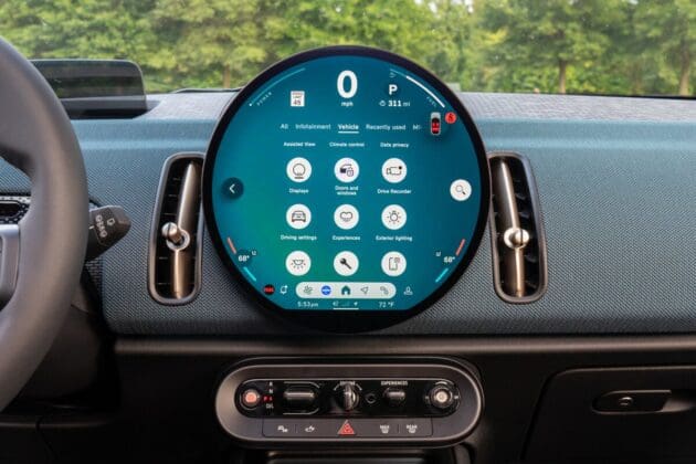 La pantalla circular para el sistema de infoentretenimiento del 2025 Mini es visualmente atractiva, con colores vibrantes y gráficos nítidos. La interfaz de usuario es lo suficientemente intuitiva como para navegar sin muchos tropiezos, pero para mi gusto, hay una plétora de opciones que podrían estar agrupadas de mejor forma. El software del sistema es ocasionalmente lento y hay muy pocos botones o perillas físicas, lo que puede requerir un poco de adaptación para encontrar las opciones en la pantalla mientras se conduce.