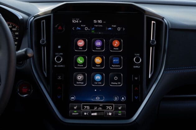 El 2025 Subaru WRX tS es el primer Subaru en exhibir un panel de instrumentos digital de 12.3 pulgadas (31 cm) por lo que merece una mención especial. Es nítido, fácil de leer y muy personalizable, lo que le imprime una atmósfera de modernidad muy necesaria en estos modelos. El sistema de infoentretenimiento STARLINK de Subaru se muestra en una pantalla 11.6 pulgadas (29 cm) bien integrada en el salpicadero. Tiene integración inalámbrica con Android Auto y Apple CarPlay, gráficos nítidos y fáciles de navegar, pero en algunas ocasiones noté su actuación algo retardada.