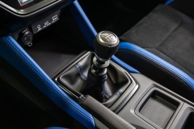 Los cambios son más notables en el interior, donde los asientos deportivos Recaro hacen que la cabina resalte. Tanto los asientos como el tablero o salpicadero, el volante y las vestiduras de las puertas están adornados con acentos de cuero azul brillante, un contraste quizá demasiado chillón para el entorno negro de la cabina.