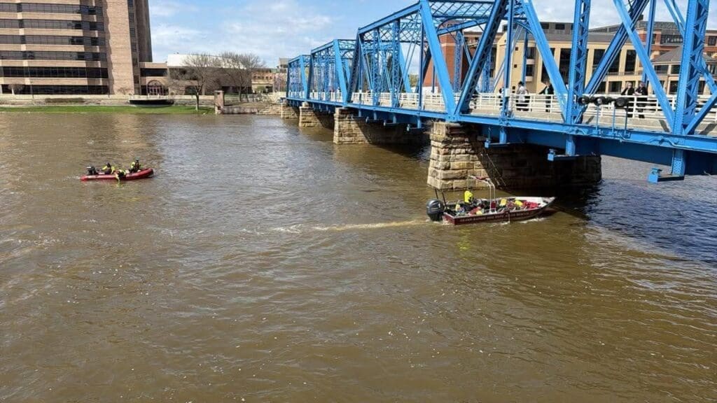 Elementos del Departamento de Bomberos de Grand Rapids mantienen activa la operación de búsqueda en el Grand River, luego de que una persona se lanzara al agua desde el Puente de Pearl Street la mañana de ayer.