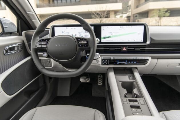 El Ioniq 6 cuenta con dos grandes pantallas horizontales de 12,3 pulgadas, una situada frente al conductor como cuadro de instrumentos y otra táctil a su lado como pantalla de infoentretenimiento, que está lógicamente organizada, responde bien a las entradas táctiles y es fácil de usar.