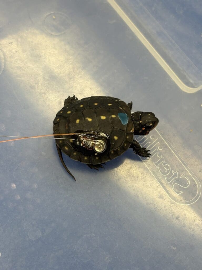 Las tortugas manchadas pesan menos de un níquel al eclosionar y son vulnerables a depredadores como mapaches, pérdida de hábitat y colección ilegal. Trabajamos con un especialista para crear pequeños transmisores para rastrear a las crías, probando su tamaño y peso con tortugas de plástico y guijarros pequeños. Al darles ventaja, aumentamos sus posibilidades de supervivencia y recopilamos valiosos datos sobre su comportamiento, poblaciones y hábitats.