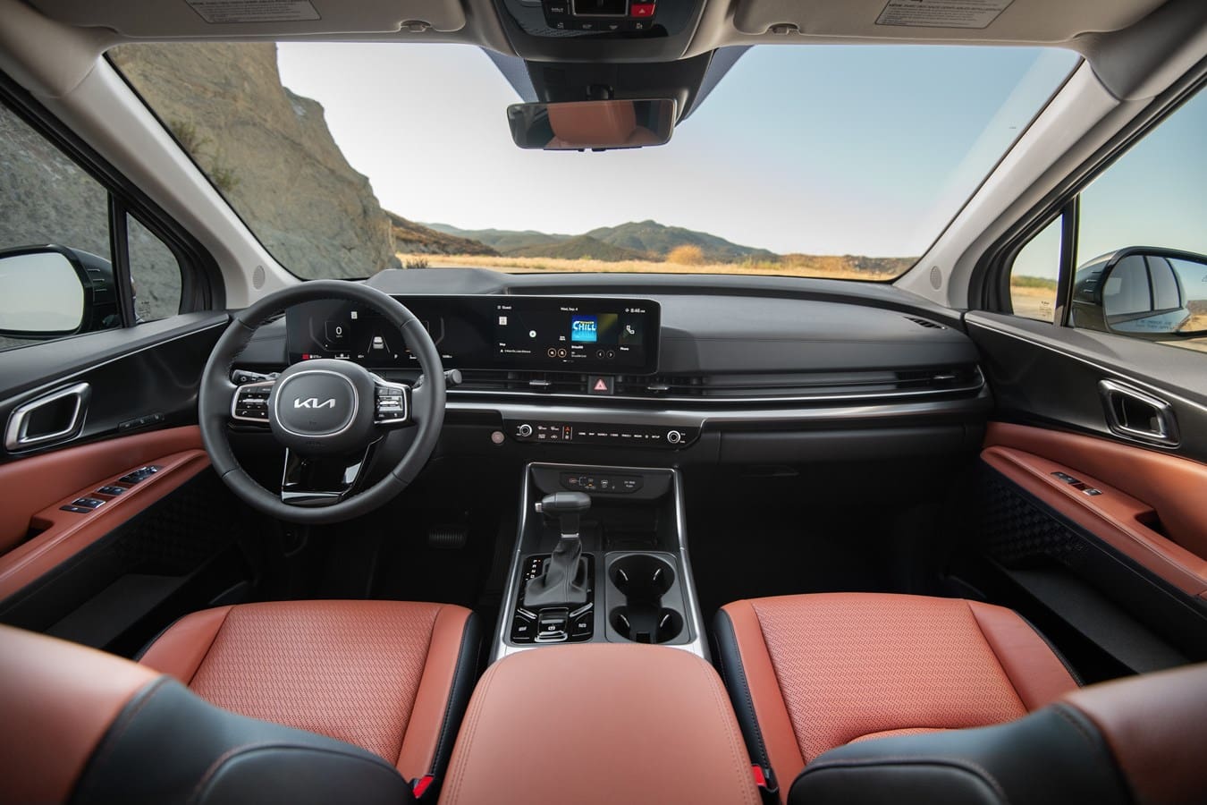 Los diseñadores de Kia dan una clase maestra de camuflaje para lograr que este “vehículo multipropósito” no parezca lo que en realidad es; un miniván, quizá solo reconocido por las puertas corredizas laterales. La amplia parrilla y el trabajo de luces delantero toman prestado del SUV Telluride, mientras que las nuevas luces traseras se extienden por todo el portón, complementando el gran logotipo de Kia.