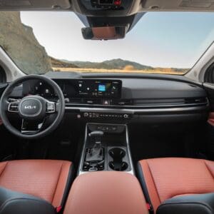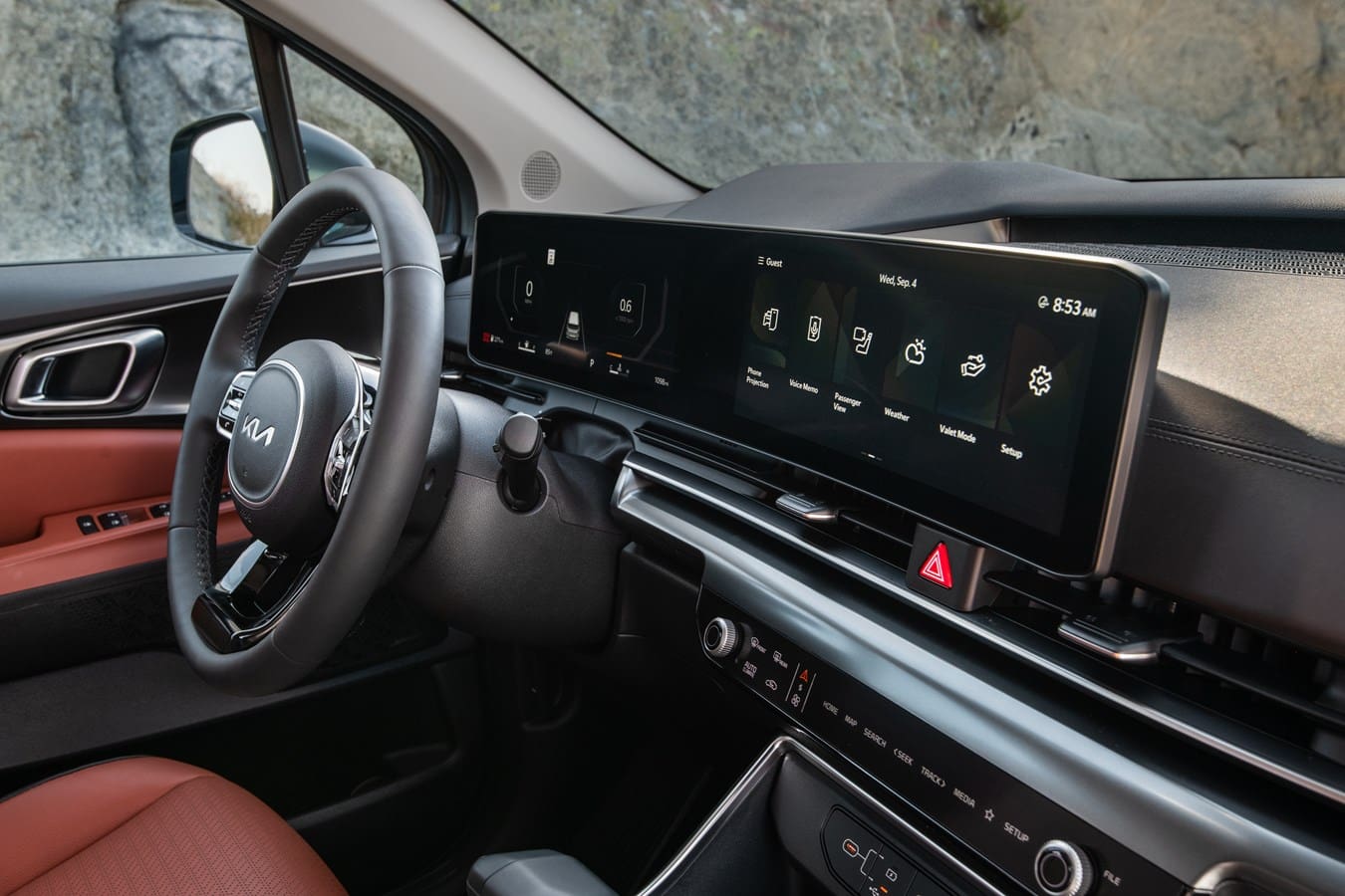 El sistema de infoentretenimiento de serie del Carnival híbrido incluye una pantalla táctil de 12,3 pulgadas (solo de 8 pulgadas o 20 centímetros en el acabado base LX) con gráficos claros y una estructura de menús sencilla. Apple CarPlay y Android Auto inalámbricos y seis puertos USB vienen en todos los modelos. Un panel de instrumentos digital curvado también de 12.3 pulgadas o 31 centímetros es una opción, que conjugada en un solo cristal con la pantalla del infoentretenimiento le atribuyen un toque lujoso a la cabina.