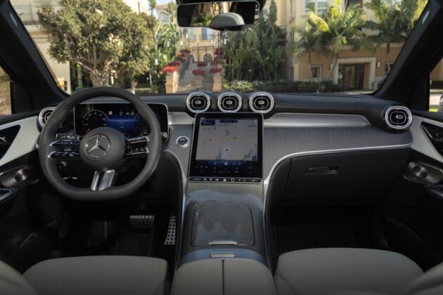 El interior muestra el lujo y la distinción que esperamos de un Mercedes-Benz. El ambiente de la cabina del GLC 350e es ligero y aireado, con elementos de diseño que transmiten una sensación muy tecnológica y futurista. La sección superior del salpicadero tiene un perfil en forma de ala con salidas de aire redondeadas, que recuerdan a las armaduras de los motores de un avión. La sección inferior fluye hacia la consola central curvada, que alberga una pantalla central táctil en forma de tableta.