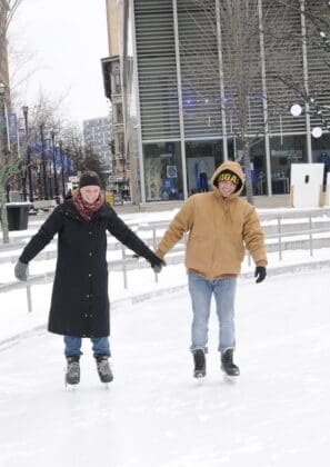 «Quisimos participar en algo diferente y divertido y yo quería patinar en el hielo, así que decidimos venir a Grand Rapids», manifestó Morgan Salas, quien había estado patinando con su esposo cuando nos detuvimos para hablar con la pareja hispana.
