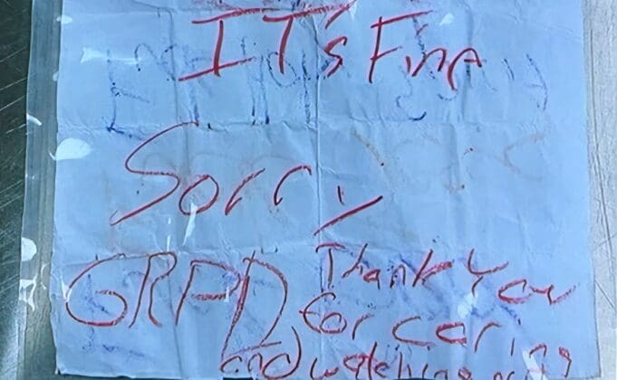 Otra nota escrita con crayón se disculpa con GRPD y les agradece por «preocuparse y cuidar».
