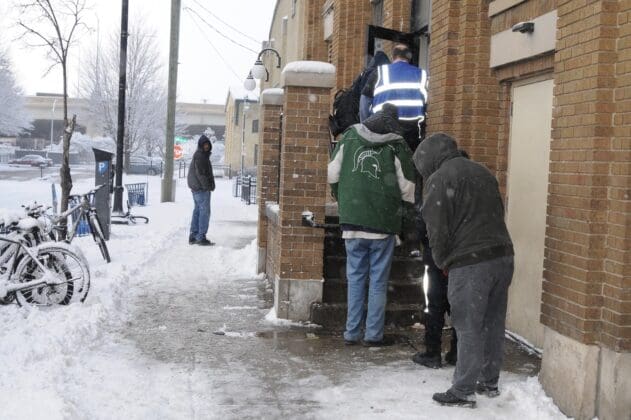 Encontramos a personas desalojadas afuera del albergue Mel Trotter en la ciudad de Grand Rapids, que esperaban en fila desde las 8 de la mañana, para ver si iba ver espacio para ellos.