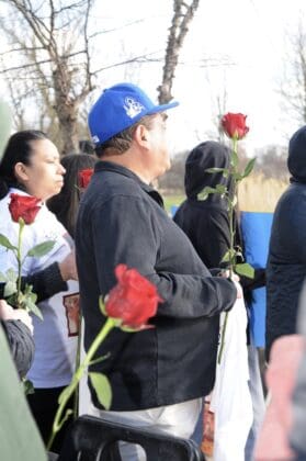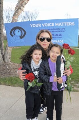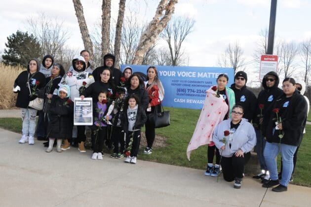 Verónica Delarosa, hermana de Eulices Delarosa de 37 años, de Comstock Park, quien fue encontrado deceso en una área arbolada cerca de la avenida Kenowa y Leanne CT SW el 11 de marzo en la ciudad de Grandville, su prima Mónica Arizola y Andriana Ramos, madre de las niñas gemelas del difunto, fueron tres de más de 120 personas que asistieron a la vigilia, presentada por el Programa Observador Silencioso y la Unidad de Víctimas y Testigos de la Fiscalía del Condado de Kent y en memoria de las víctimas de la violencia.