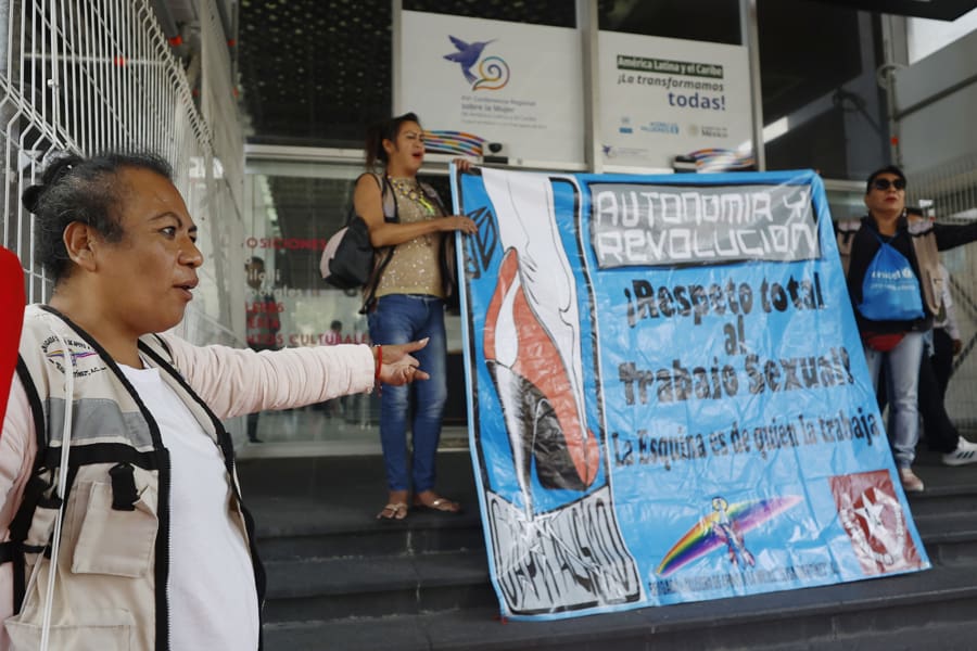 Mujeres que se dedican al trabajo sexual protestaron este miércoles para exigir ser incluidas en la agenda de la XVI Conferencia Regional de la Mujer, organizada por la Comisión Económica para América Latina y el Caribe (Cepal) de la ONU, que este año se celebra en México.