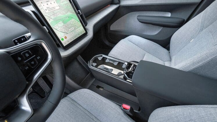 El interior es puro minimalismo sueco en esteroides. En el EX30 utiliza materiales reciclados para una huella ecológica más sostenible. Una opción de tapicería, por ejemplo, utiliza residuos del proceso de reciclaje de telas mezclilla, mientras que otras opciones incluyen un interior cosido con lino y una alternativa de lana hecha de poliéster reciclado.